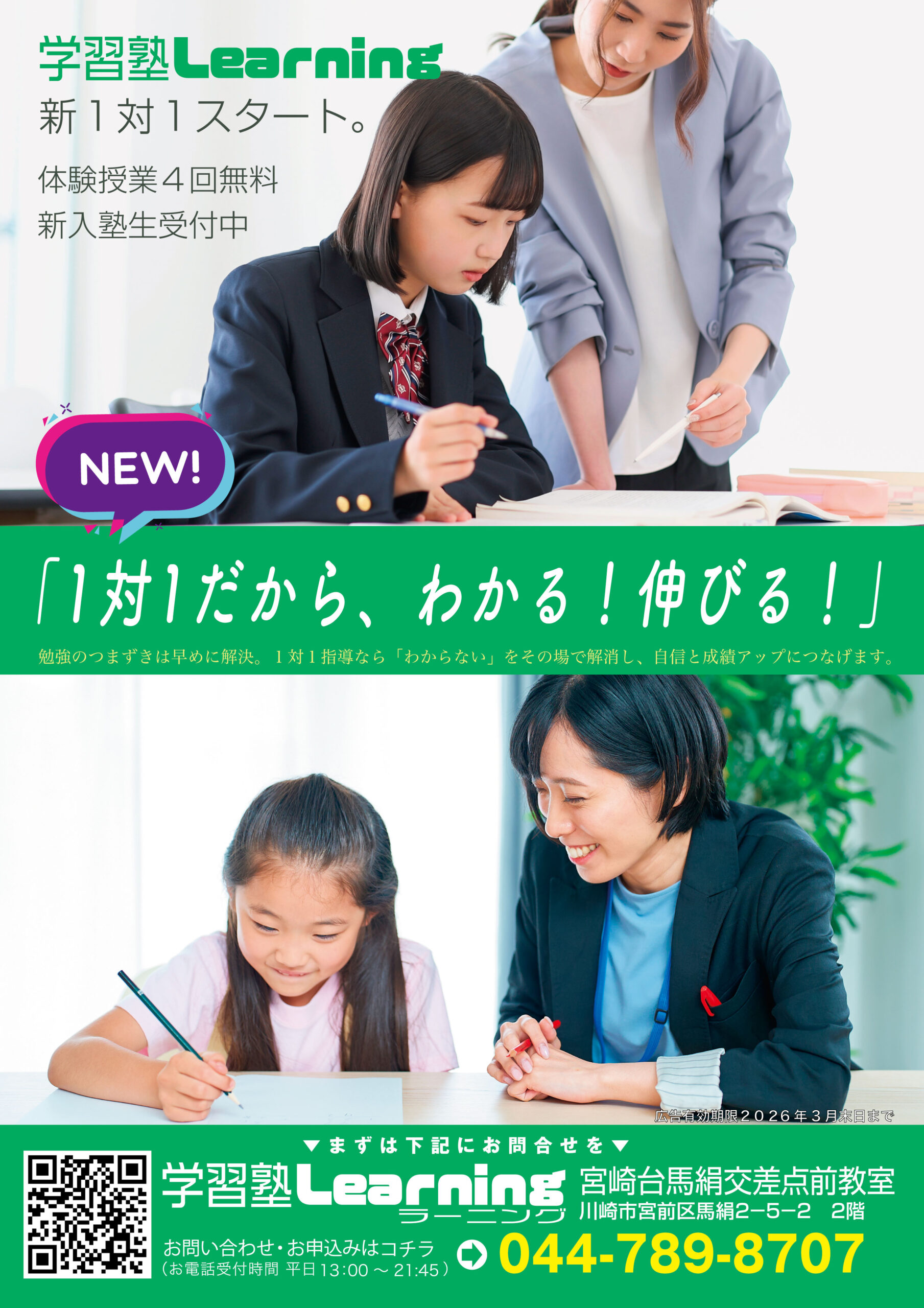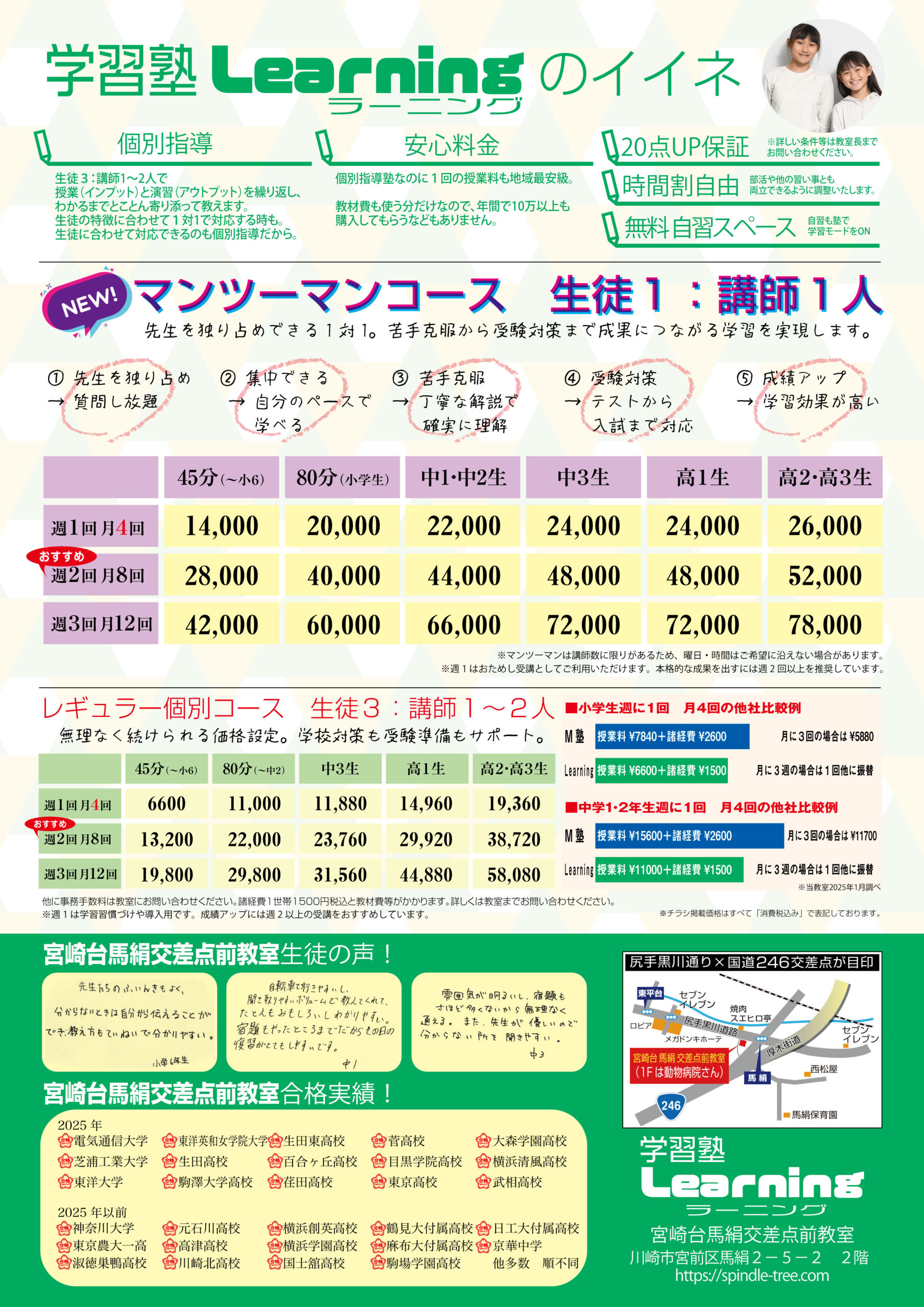 宮崎台馬絹交差点前の学習塾Learningなら、学校ではできないご自身の弱点カウンセリングから、実際の個別指導までを無料で行います。理解が進んだ!と実感できればご入塾ください。